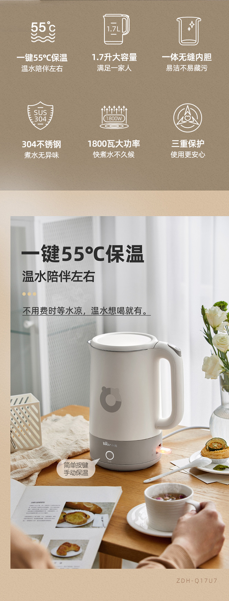 小熊(bear)电水壶电热水壶55度保温功能一体 无缝内胆 ZDH-Q17U7